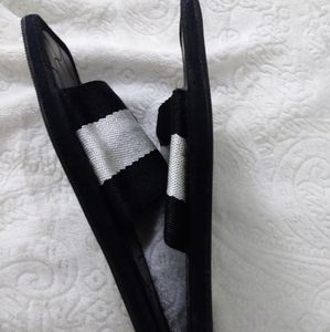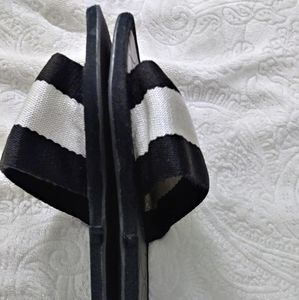 Stylish and comfy Gucci slides featuring black and white canvas bands and the letter G embossed all over the inner sole