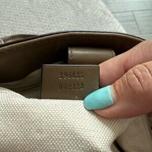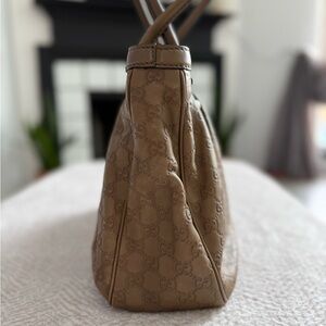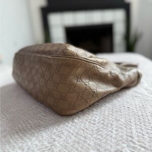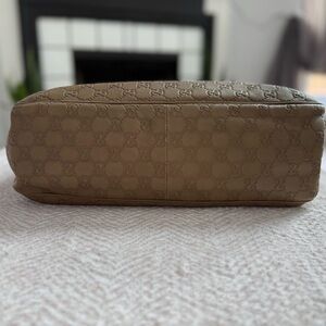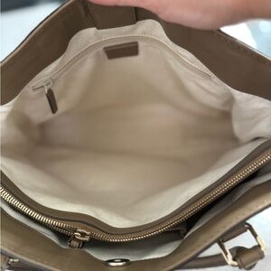 Experience the epitome of luxury with this Gucci brown tote, crafted with a sophisticated silhouette and leather trim. The bag's elegant design and neutral color make it a versatile accessory for any occasion. Its high-end appearance is enhanced by the textured pattern and metal hardware details.