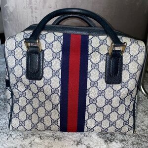 Authentic Gucci handbag from the Accessory Collection. Signature navy monogram print with red and navy stripe. Original hardware and zipper closure. Pre loved and in good condition for a classic, vintage piece.