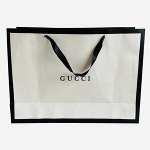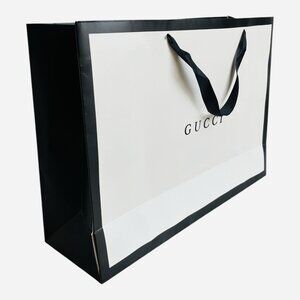 Add a touch of luxury to your collection with this Authentic Gucci White and Black Paper Shopping Gift Bag featuring elegant ribbon handles. Measuring approximately 17"x5.5"x12.5", this large designer bag is perfect for storing accessories, gifting, or display. The classic Gucci logo design and sturdy construction make it a chic reusable piece, while the ribbon handles add a refined finishing touch. In good plus condition, it shows light wear consistent with gentle use, maintaining overall durability and stylish appeal. Ideal for Gucci enthusiasts, collectors, or anyone who loves designer presentation, this versatile bag is a practical and fashionable choice. Elevate your packaging or collection with this timeless Gucci original.