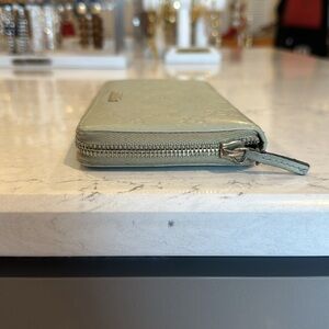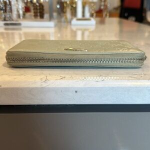 Zip closure. Interior with zippered coin pocket, 3 compartments & 12 card slots. Some dirt around zipper line and interior. Some scratches on gold tone hardware.