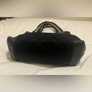 Super cute Gucci black monogram mini shoulder tote with sherryline canvas handles. Shows normal wear throughout (small scratches on leather, minor marks on canvas) but no rips or rubs. Both interior pockets clean. 9.5 x 9 x 4.5 inches
