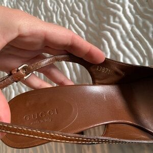 Authentic Gucci heels. Size 7. Gently used. In great condition only used 2 times. Well taken care of has lots of life still in them. Very comfortable. Tan leather trim with gg printed denim fabric. Has gold hardware with bamboo signiture buckle. Ankle strap is adjustable. Pair with Gucci bamboo buckle belt from my closet check it out.