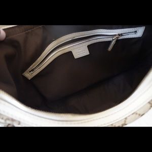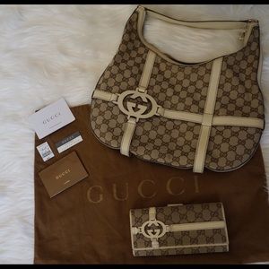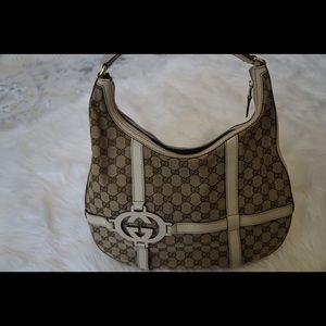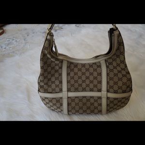 Gucci shoulder bag with off white leather GG. In great condition. No stains or tears. Rarely used. Dust bag included. L 15 x W 2 x H 9.75. Wallet not included and has been sold separately.
