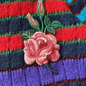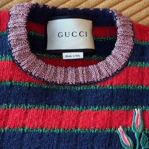 Authentic Gucci crewneck sweater, multicolor striped & metallic with flower. Puffed shoulders. Size XS, made in Italy. Wool & Cashmere blend. Preowened condition, no damage or stains. NO TRADES or low offers.