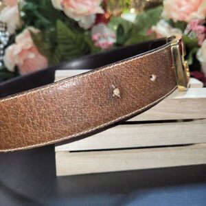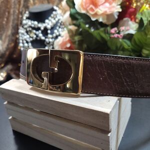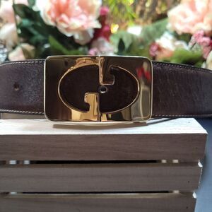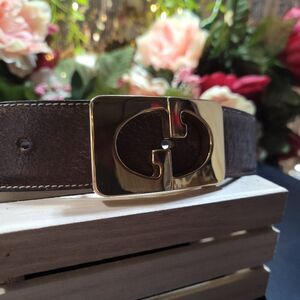 Beautiful Gold and Brown leather belt. Buckle is gold tone double G outlined. Belt itself is brown leather. The buckle is in great condition with minor scuffs and rubs for age and use. Belt length is 30 in from tip to buckle hook. There are holes located at 24.5 in, 25.5 in and 26.5 in. The previous owner created and extra hole 23.25 in. It is hard to notice that the hole was not originally there. Please see photos.