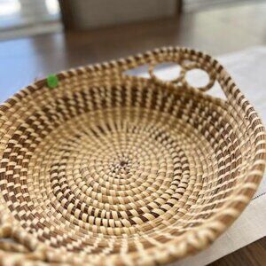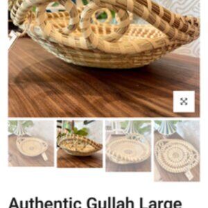 Pre-owned in great condition-**One flaw - see picture** Authentic Gullah Sweetgrass Basket - Large. Retails from $425.0 - $625.00. Beautifully handwoven with natural fibers of low country sweetgrass, bulrush, pine needles and palmetto fronds. Historically, these baskets were used for practical purposes like winnowing rice and carrying goods. The artistry of sweetgrass basket weaving has been passed down through generations within the Gullah community. These baskets are considered significant cultural souvenirs and works of art. Measurements: 15 1/4" wide with handles, 8 1/2" base.