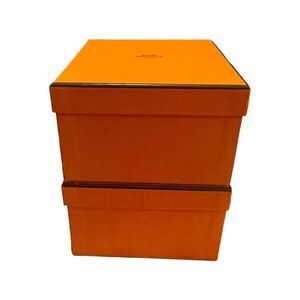 This is an authentic HERMES Paris gift box in a vibrant orange color. It measures 7x8x4 inches and comes with a protector insert. The box is perfect for any occasion and is made of high-quality cardboard material. It bears the HERMES brand name and was manufactured in France. This item is a must-have for any designer or urban vinyl collector and can hold one item.