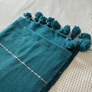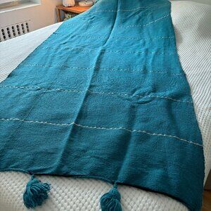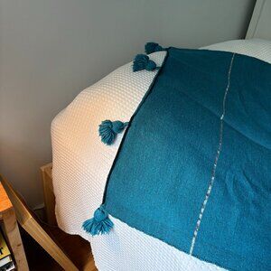 This authentic handcrafted blanket is from the Moroccan town of Essaouira, a beautiful little place on the Atlantic Ocean, about three hours from Marrakech. Great blanket that makes a perfect throw for the sofa, or it will fit the length of a twin bed. (In the picture it is on a double bed, and as you can see it is smaller than that—although it can certainly be thrown over the bed for decoration as well.) A deep teal with striking silver stripes throughout. It would also make a great picnic blanket for the park!
