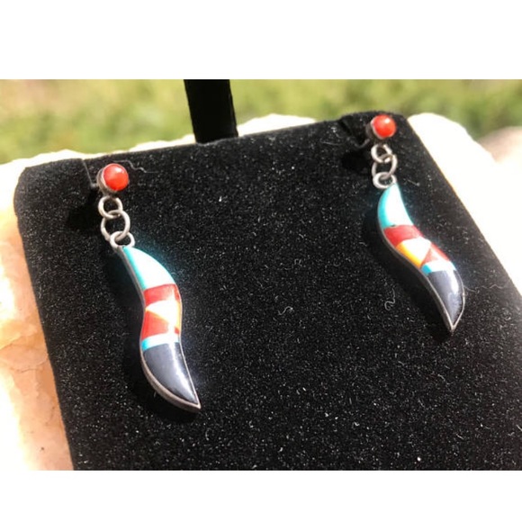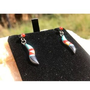 These stud earrings are authentic Native American handmade jewelry. They were handmade on the Taos New Mexico Pueblo. Sterling silver with turquoise, onyx, and red coral.