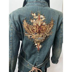 Harley Davidson original Harley Denim Jacket with lots of details and embroidery on it. It has brass grommets on the sleeves, and leather detailing on the belt and pockets. A must-have for your favorite Harley lover! Size Large