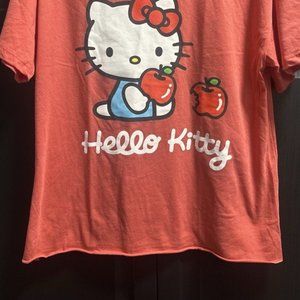 Super soft, authentic Hello Kitty (with apples) tee shirt. Short sleeve with turned back cuff. Raw hem. Solid back. 50% cotton, 59% Polyester. Faded red, almost dark coral ground color.