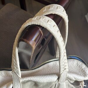 Beautiful π buttery soft leather with stitching on handles and canvas with leather on bottom Baby blue silk lining . Has lock π and 2 keys π π. In new condition. Absolutely stunning. No stains , holes pr smell . Two sided zippers with leather tassels and hold hardware. Inside smaller pockets for wallet and accessories Non smoking pet free home . No dust bag . Perfect summer or fall ππ addition.