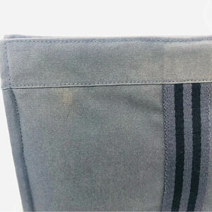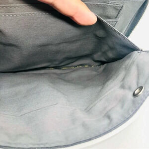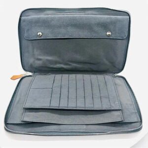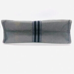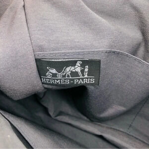 Guaranteed Authentic HERMÈS Fourre Tout Clutch Bag and Wallet / Organizer. Size: Bag: 8.5”H x 12”L x 4”W. Wallet: 5.5”H x 8.5”L x .75”W. Color: Dark Gray with Black double stripes. Silver zipper runs smoothly with leather zipper pull and zipper stop. Fabric: 100% cotton. Made in France. See picture for authenticity code along the zipper of the bag. BAG: inside is pristine with 3 side pockets. Signs of use, fade spots / on the outside. WALLET: fade spots on the outside. Inside has 2 side pockets, 1 compartment with 2 button closure. 7 credit card slots. Note: there is a tear on inside of the buttoned compartment ( see picture, still highly usable and not obvious when it is closed ). Some glue residue on one of the buttoned compartment. Overall decent, highly useable with lots of life left. See all photos and video for visual description of the actual items.