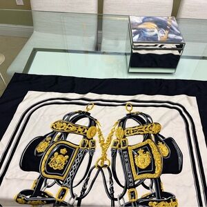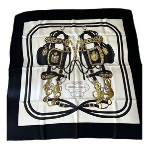 Elegant Hermès silk scarf featuring a classic equestrian design. Black, gold, and white colors.
