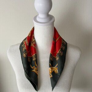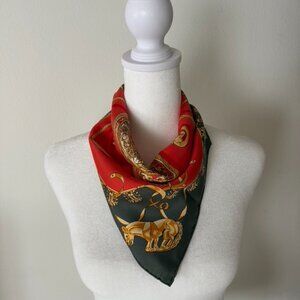 HERMES Vintage ‘Les Cavaliers D’Or’, Vladimir Rybaltchenko, red and gold-tone 100% silk printed scarf, circa 2000 featuring hand rolled edges and ‘les cavaliers d’or’ motif printed, first designed in 1975 and due to its popularity re-issued numerous times since.
