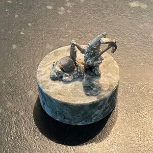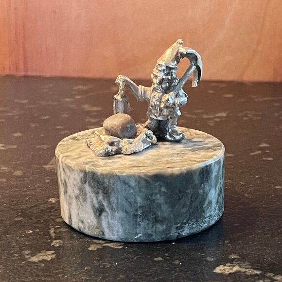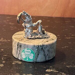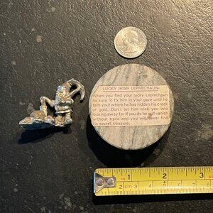 At some point, the Leprechaun figure became separated from the pedestal, without any damage to either. I could have applied glue, silicone, or some other epoxy before posting them here but decided to let the new steward make that decision. Whatever choice would be a pretty simple operation. Or...the leprechaun can settle nicely on the pedestal without being glued at all--or be placed somewhere else on its own. I did not want to limit the options. See photos for details. Weight: 7.7 oz.