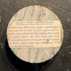 The tag on the bottom of the marble pedestal reads: "LUCKY IRISH LEPRECHAUN -- When you find your lucky Leprechaun be sure to fix him in your gaze until he tells you where he has hidden his crock of gold. Don't let him trick you into looking away for if you do he will vanish without a trace and you will never find his secret treasure."