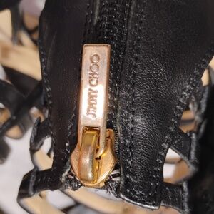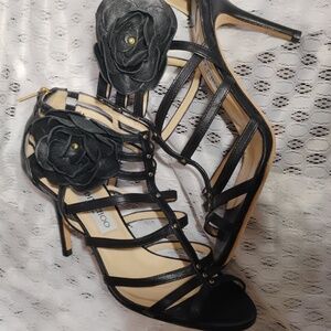 Authentic Jimmy Choo Black Leather Opaque Flower Cage Sandals