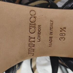 These sophisticated Jimmy Choo sandals has earned a loyal following because of its inspired accents. This absolutely gorgeous sandal with edgy lattice aged design creates a fashion forward look. Featuring a smooth strappy upper, it has a rounded open toe, pale gold tone studs and a layered leather flower on the side. Also has a rear zip closure with Jimmy. Choo logo. Made in Italy. These sandals have never really been worn you can see by bottoms. impeccable condition. size 38 1/2 . original retail is $1259.00. WOW what a deal. Offers beautiful style and comfort.
