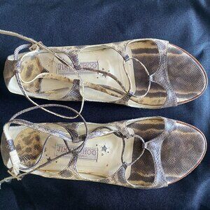 Classic Jimmy Choo taupe neutral lizard/ snake gladiatior sandals. In good pre-owned condition. They are a 36.5, i normally wear a size 7 and they fit me fine. The buckles are in good shape, the elastic has lost a little bit of elasticity but still works great. Very comfortable and they go with everything.