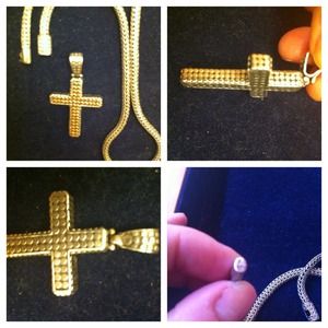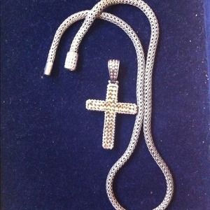 Authentic John Hardy woven chain measuring 16" and 5mm in width with a reversible cross pendant from the dot collection. Sterling silver Cross reverses to feature one side of gold dots. The cross pendant is substantial in size. Purchased at Neiman Marcus in Palo Alto. The chain currently retails for $675 pretax and the cross for $895 pretax. No trades ๐