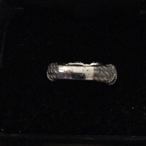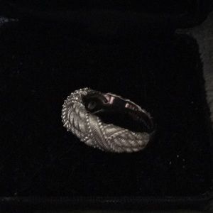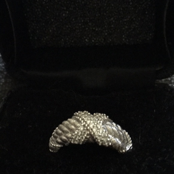 This authentic Judith Ripka crossover ring is very tres chic! Sterling silver ring with simulated pave Diamonique stones form an “X” at the center. Classic cables and in true JR attention to detail, an additional crossover adorns each side. Size 6.