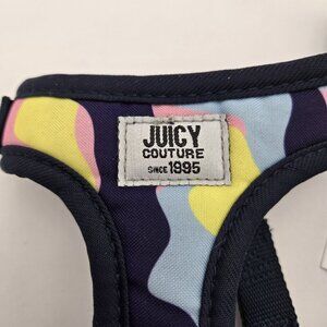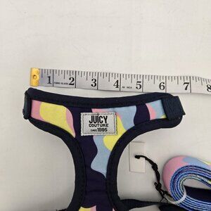 The product is an authentic Juicy Couture 6 ft leash harness designed for small dogs. It features a camo pattern in pink, yellow, and blue, making it stylish and fun for pets. The adjustable design ensures a comfortable fit for your furry companion while on walks or outdoor adventures. Made by the reputable brand Juicy Couture, this leash harness combines fashion and functionality for a trendy pet accessory. Please review photos for measurements. Fast shipping and smoke-free home.