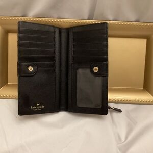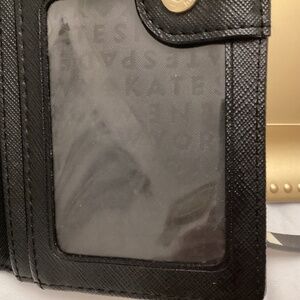 Authentic Kate Spade striped wallet that is black, white, blue, and pink striped. The gold hardware on the front of the wallet has a scratch on the name plate, it has never been used it is in good shape.