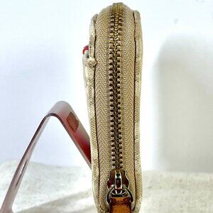 Add a pop of playful sophistication to your essentials with this Kate Spade zip-around wallet. Crafted from cream logo fabric and accented with a vibrant pink and orange stripe, this wallet features gold-tone hardware and a signature Kate Spade New York leather plaque for elevated branding. The zip-around closure secures multiple card slots, a coin pocket, and space for cash—making it both stylish and functional. Gently used and in excellent condition, it’s the perfect blend of fashion and practicality for everyday use or gifting.