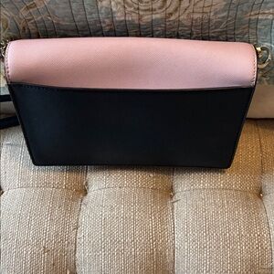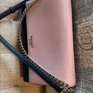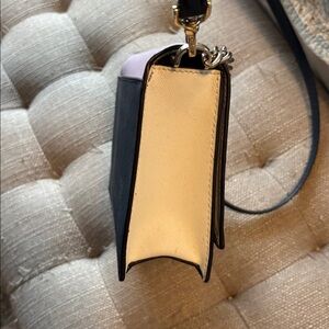 Please look at all the photos. The inside lining does have stains on it. My client said it was her make up. She has not tried to remove it. It does not affect the use of this bag, but I just want you to be aware of it the outside does have a few marks, but it does not take away from this bag. It is a purple with blue and white or cream color. It has a chain to carry it or a Crossbody to wear it it measures 9 inches crossed by 6 inches high by 2 inches wide. Non-smoking home.