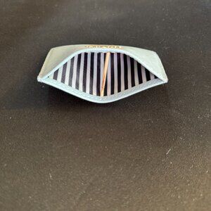 Crafted in crosshatched leather with gold-tone hardware and striped lining.