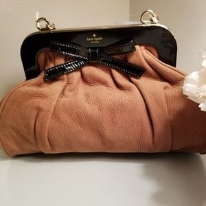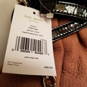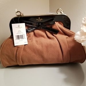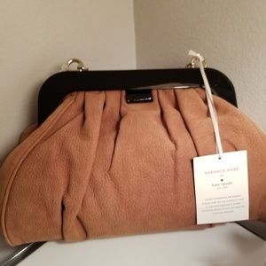 Beautiful suede shoulder handbag. Color is toasted macaroon with black bow and accent along top opening. Chain link hardware is a very light gold color. Brand new condition. Comes with dust bag and measures 12x4x10 a rare find.