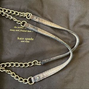 In excellent used condition. Inside of the bag is pristine, slight fading on the straps and bottom corners (see photos). Authentic Kate Spade faux snake skin purse with gold chain straps. Large interior middle zip pocket, two large pockets in either side with small wall zip and cell phone slots. Front outside pocket with emblem. Comes with original duster bag