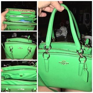 Like new in Excellent condition. Beautiful color. 11" L x 7" H x 4" w. Has 3 compartments in purse, 2 zippered and one snap. One of the zippered has a small zipper inside for lipsticks and things. Wallet has lots of compartments and zipper for change. Cross posted. 🚨🚨today only $225🚨🚨 Or will trade for a Michael Kors purse & wallet or Dooney & Bourke purse and wallet.