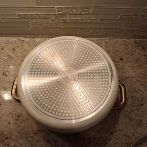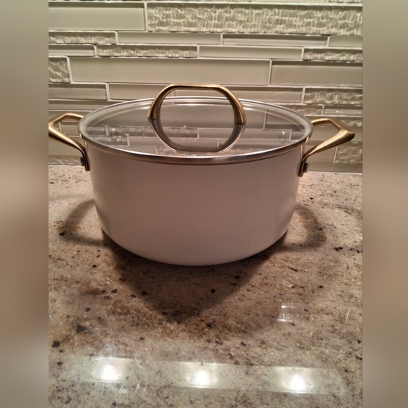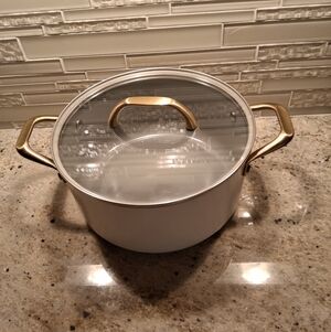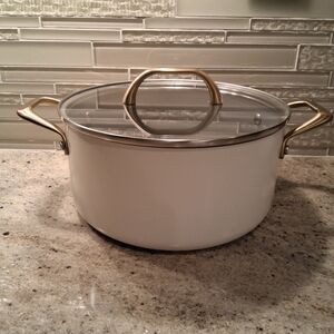 Authentic Kitchen 6qt stock pot. Creme with gold brushed hardware. Glass lid. Ceramic nonstick. 9 1/2"dia.x4 1/2"h. New.