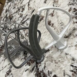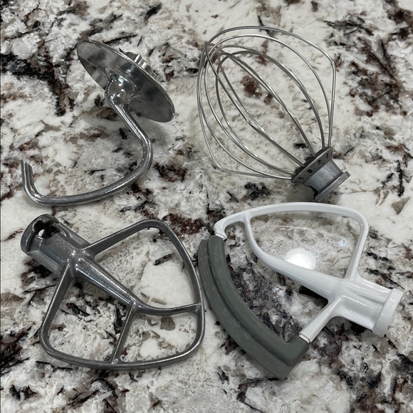 Authentic KitchenAid attachment set. Gently used OEM original whisk, dough hook and dough beater, plus white coated spatula scraper head. Fits 4.5 and 5 quart tilt head stand mixers. Fast shipping from a clean smoke free home.