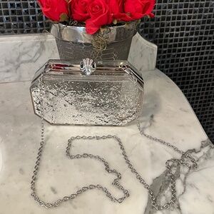 Authentic Kurt Geiger London clear floating silver sparkle chain bag. This bag is Like New Only worn once in Excellent condition. Comes with dust bag! Chain is silver and is removable so can be worn as crossbody or as a clutch for an evening bag. Features the beautiful icon kurt Geiger bird head embellished with stones. This bag is So UNIQUE! It’s a clear plastic box with silver sparkles on the interior wall that fall to the bottom leaving the box looking mostly clear…but when you shake the bag the sparkles flow all over and cascade down! Simply a work of art! Don’t miss out on this Rare unique bag!