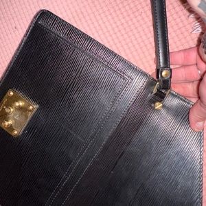 This stylish clutch is crafted of leather in black textured epi leather, in a thin folder structured shape with expandable sides and a v-shaped frontal flap ( with a wrist strap ). There is a beautiful goldtone lock closure - you see in front. Some scratches on hardware. The interior is grained black leather with a zipper pocket.