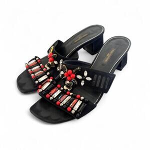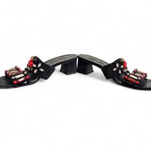 Black and red beaded sandals with a 2-inch heel