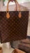 This stylish business tote is crafted of signature Damier coated canvas in brown. It features rolled leather top handles, polished brass hardware.
