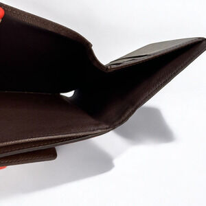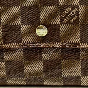 This Louis Vuitton Damier Portefeuille Elise is a great find for LV and luxury bag collectors. The compact trifold features the Damier Ebene coated canvas exterior and brown leather interior.