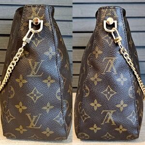 Authentic Louis Vuitton Monogram Looping converted into a crossbody. Brown monogram coated canvas with gold d-rings added so it can be worn as a crossbody. Top zip closure. An authentic Louis Vuitton adjustable monogram crossbody strap with added unbranded gold clips. The interior lining is an ivory ultra suede with one zippered pocket and a small slip pocket. The lining has minor stains and signs of usage along the zipper line. Exterior is in good condition, but there is some age related fading. Comes with a dust bag.