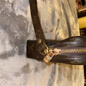 Authenticated - SUPER RARE Custom dyed black leather. The Marly Dragonne GM features a monogram canvas body with leather trim, a front exterior zip pocket, a flat wrist strap, a top zip closure, and an interior zip pocket. It carries a B+ condition rating.No tears/ rips on canvas. Refinished interior felt pocket. Exterior bottom corners are slightly peeled. Zipper and gold details are slightly tarnished from minor wear. In great used condition.