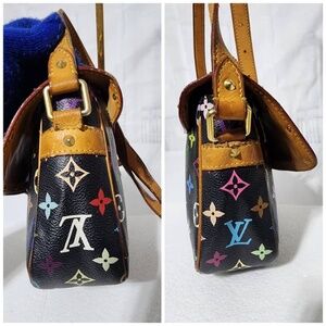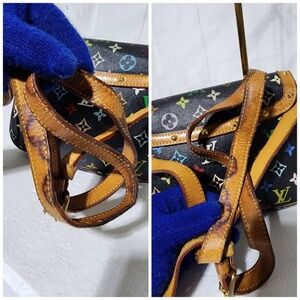 This authentic LOUIS VUITTON Monogram Multicolored Sologne Crossbody Bag is in it’s pre-owned condition. The exterior multicolored coated canvas is clean and beautiful. The leather trim that runs across the bag shows watermarks wear and aging to it. Interior is clean, it shows sign of use. The opening to the flap shows sign of wear/ watermark. The date code is faded on the interior suede.