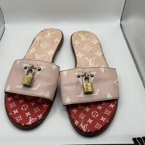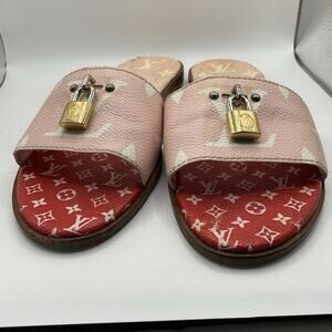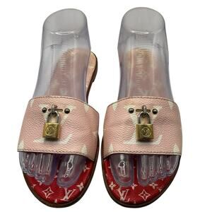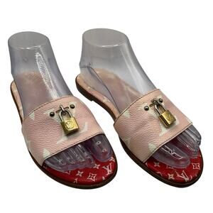 Authentic LOUIS VUITTON Pink Monogram Lock It Flat Mule Slides Size 37.5