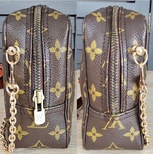 Authentic Louis Vuitton Trousse De Toilette clutch bag converted into a crossbody. Brown monogram coated canvas with an ivory waterproof pvc interior. Zippered closure. Zipper works perfectly but is a little tight. Should slide easier with use. Unbranded d-rings added to both sides. The interior has a slip pocket and 3 elastic holds. An authentic Louis Vuitton crossbody strap is included. Great like new condition! Comes with dust bag and unbranded accessory chain.