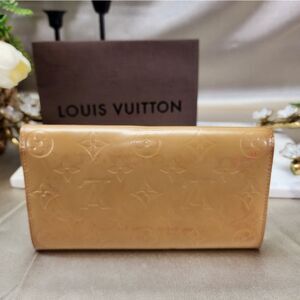 This wallet is a Louis Vuitton Vernis Portefeuille Sarah Long Wallet. The color is a golden color with brass hardware. This wallet is in such good condition with very minor signs of any wear or use. Please review photos as they are part of the description. The wallet itself is in great condition. There is very minor chipping on the corners. The back has so minimal color transfer which is extremely common with the vernis style items. The brass hardware is shiny and shows no signs of oxidation or discoloration. The inside is clean and in great condition. The front flap snaps close with a snap button. There are 2 card slots on the front side, 4 card slots inside the wallet, a bill slot and a zipper change pocket. The wallet is in really good overall condition.