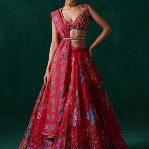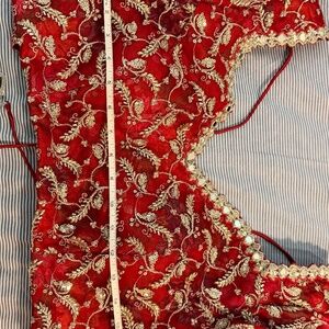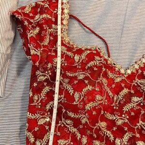 This is chanderi lehenga. Worn only once. The blouse pattern is little different. I have attached the original blouse design as well. The skirt is 40 inches long.