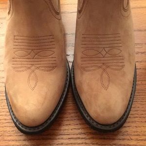 These are hard toe cowboy boots made with real leather. They feel like suede and have a pink design on them. I got these in Nashville Tennessee in an authentic boot shop.